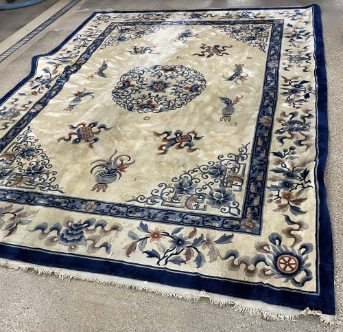 Beautifully cleaned commercial oriental rug with cream background and blue floral patterns, looking vibrant after professional rug cleaning by Dalworth.