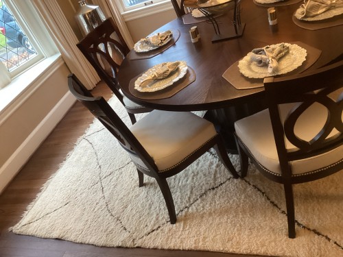 Expert cleaning service for a white textured shag rug under a dining table in a residential home, showcasing Dalworth Rug Cleaning's results.