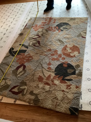 A beautiful floral pattern area rug being carefully measured on top of a SpillGuard rug pad on a wooden floor, demonstrating the precise process for residential rug cleaning and padding.