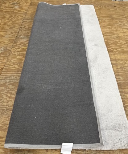 Underside of a light-colored residential rug laid out on a wooden floor for inspection before cleaning.