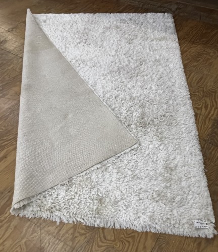 A clean white shag area rug, with one corner folded to show the beige non-slip backing, resting on a wooden floor after professional residential cleaning by Dalworth Rug Cleaning.