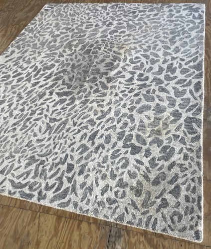 Top view of a freshly cleaned modern abstract patterned area rug in shades of grey and off-white after professional cleaning by Dalworth Rug Cleaning