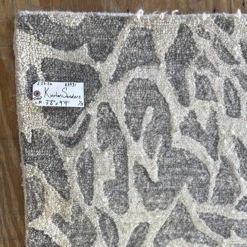 Close-up detail of the cleaned textured rug showing its pattern and a service tag with customer name Kirstan Sanders and dimensions 7'8" x 9'9" from Dalworth Rug Cleaning