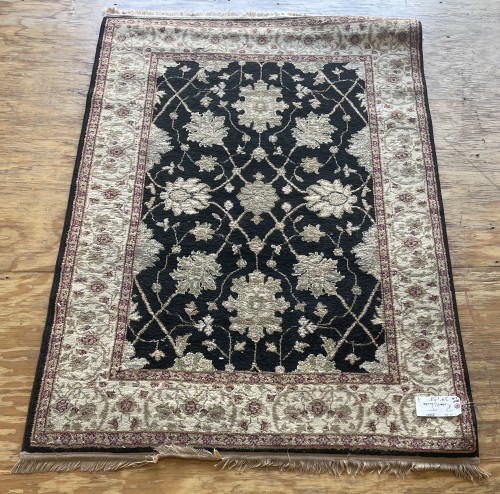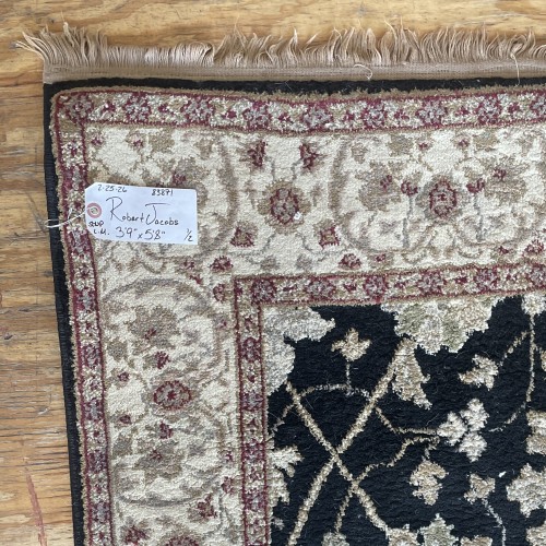 Full view of a cleaned Robert Jacobs residential rug featuring intricate black and beige floral patterns with a decorative border, laid flat on a wooden surface.