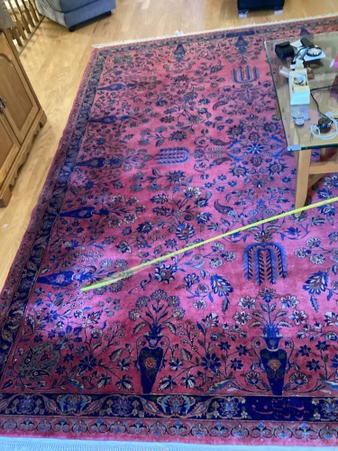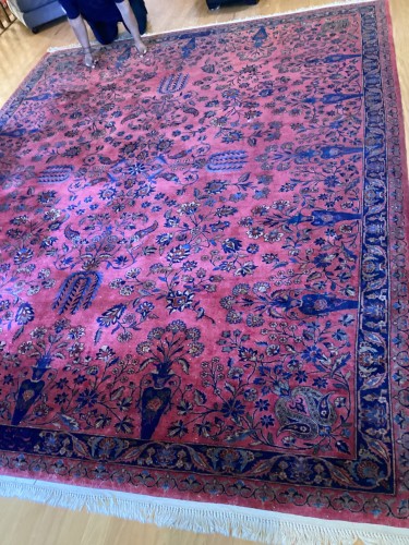 Provided professional residential rug cleaning services to remove marks and refresh the rug's appearance. The large pink and blue ornate rug was thoroughly cleaned.