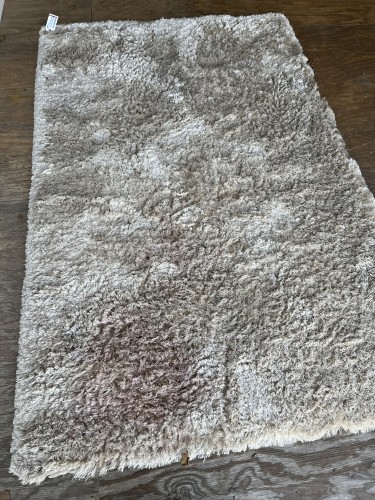 Residential shaggy rug showing faded areas and moderate soil before professional cleaning.