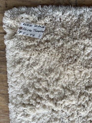 Close-up of a cleaned residential Neisha Thavara rug, showcasing restored texture and color with a service tag.