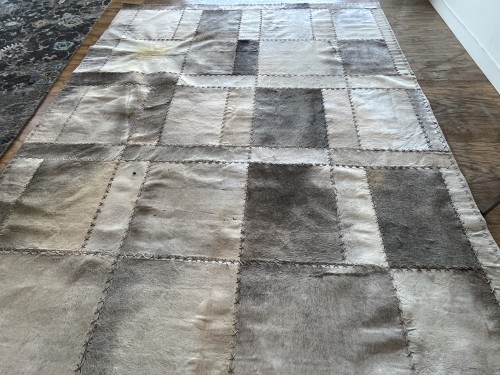 A residential patchwork cowhide rug exhibited heavy to moderate soil accumulation and noticeable faded areas that required professional cleaning.