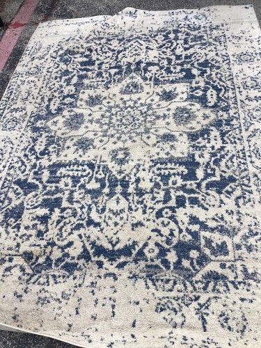 We performed a comprehensive deep-cleaning process to extract embedded soil and revitalize the rug's blue and white patterns. Our technicians used specialized pile-lifting tools to correct nap distortion and furniture indentations. Finally, we executed a professional serging repair to fix the frayed edges and secure the rug’s perimeter.