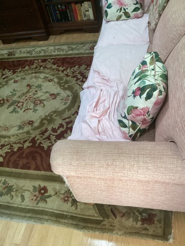The customer required specialized restoration for a residential area rug that was suffering from heavy to moderate soil buildup and significant nap distortion. The rug also showed physical damage, including a frayed serge on the edges and deep indentations from furniture marks, necessitating professional repairs.